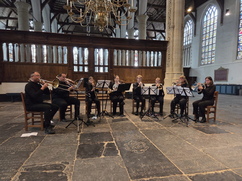 ![]() Het dubbelkwartet van Kunst na Arbeid Purmerend bestaat nog niet zo lang, pas sinds dit jaar. Het is een gelegenheidsensemble dat kan zorgen voor muzikale omlijsting bij kerkdiensten en dergelijke. Het dubbelkwartet bestaat uit twee bugels, twee trompetten, één hoorn, twee tenor trombones en een bas trombone. | ||